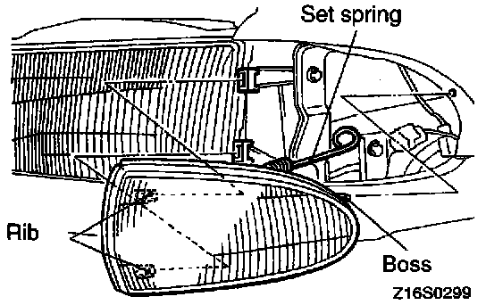 2. While pressing in the front turn signal light towards the rear of the vehicle, hook the set spring to the fender shield inner to secure the front turn signal light to the vehicle body.