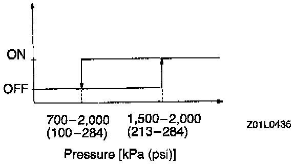 The battery voltage in the engine control module is applied through a resistor to the power steering pressure switch. Steering operation causes the power steering fluid pressure to increase, turning the switch on. As a result, continuity is produced between the battery voltage applied and ground. This causes the power steering fluid pressure terminal voltage to go from high to low.