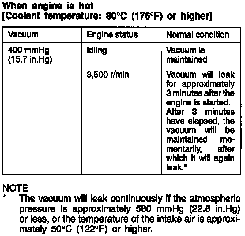 NOTE: The vacuum will leak continuously if the atmospheric pressure is approximately 580 mmHg (22.8 in.Hg) or less, or the temperature of the intake air is approximately 5OOC (122°F) or higher.