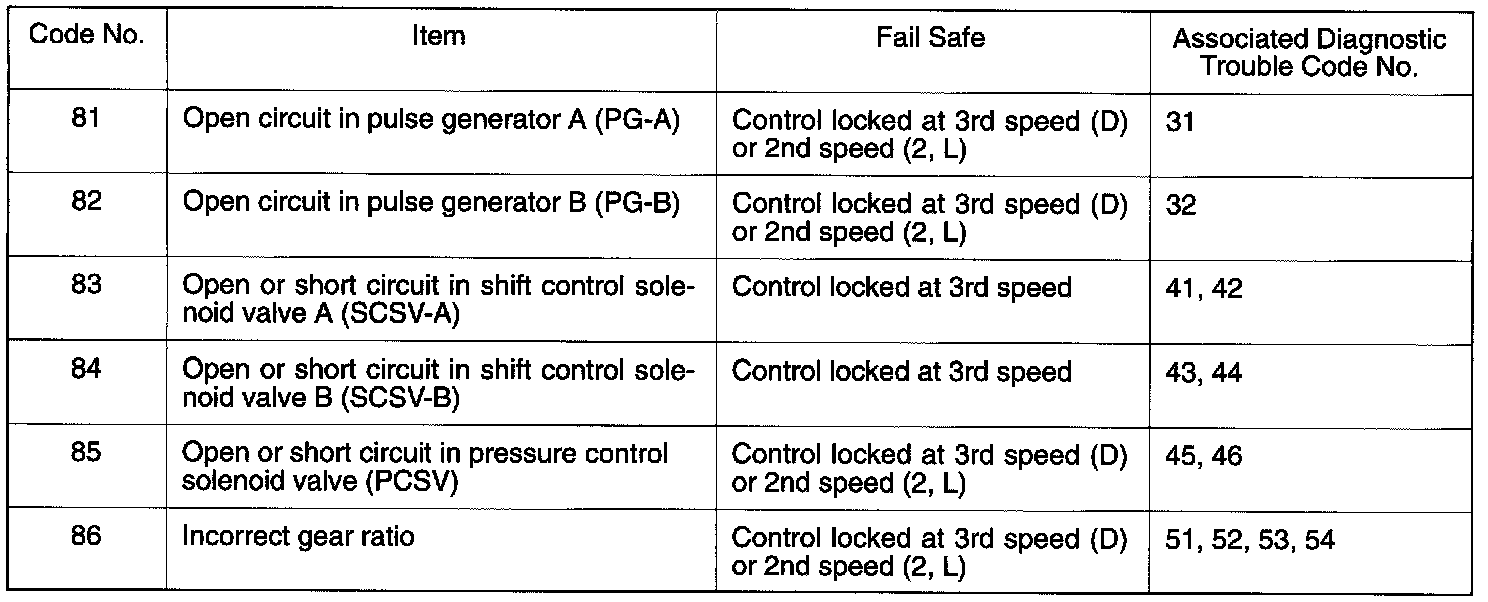 The fail safe function which locks control at the 3rd or 2nd speed is canceled when the ignition key is turned OFF. (The code numbers stay in memory.)