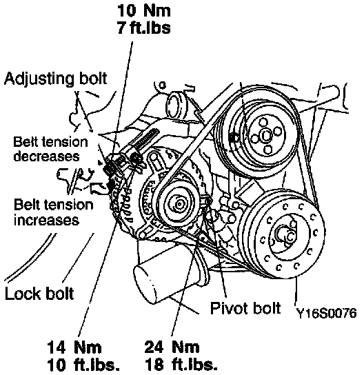 5. After adjusting the belt tension, fully tighten the nut of the pivot bolt and the lock bolt to the specified torque, and then tighten the adjusting bolt to the specified torque.