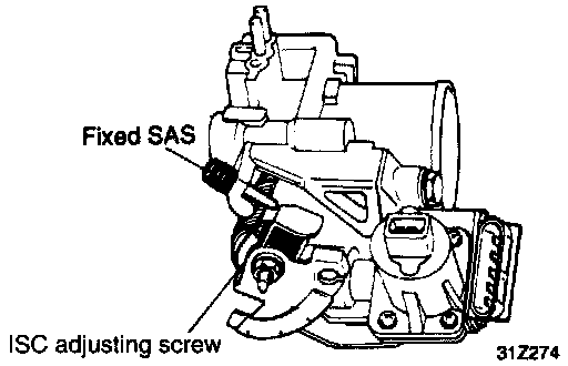 4. In order to prevent the throttle valve from sticking, open it two or three times; then release it to let it click shut, and sufficiently loosen the fixed stop adjusting screw. Start the engine and let it run at idle speed. Adjust the Idle Speed Control Motor adjusting screw to obtain the standard rpm.