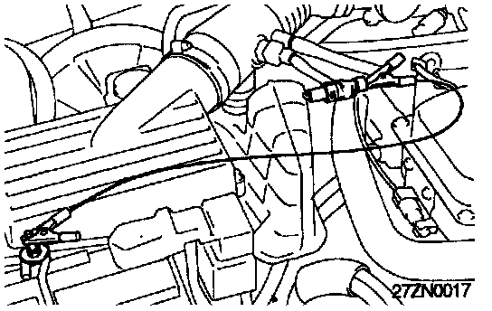 3. With the engine stopped, connect a lead wire, between the terminal for ignition timing adjustment (located in the engine compartment) and ground.