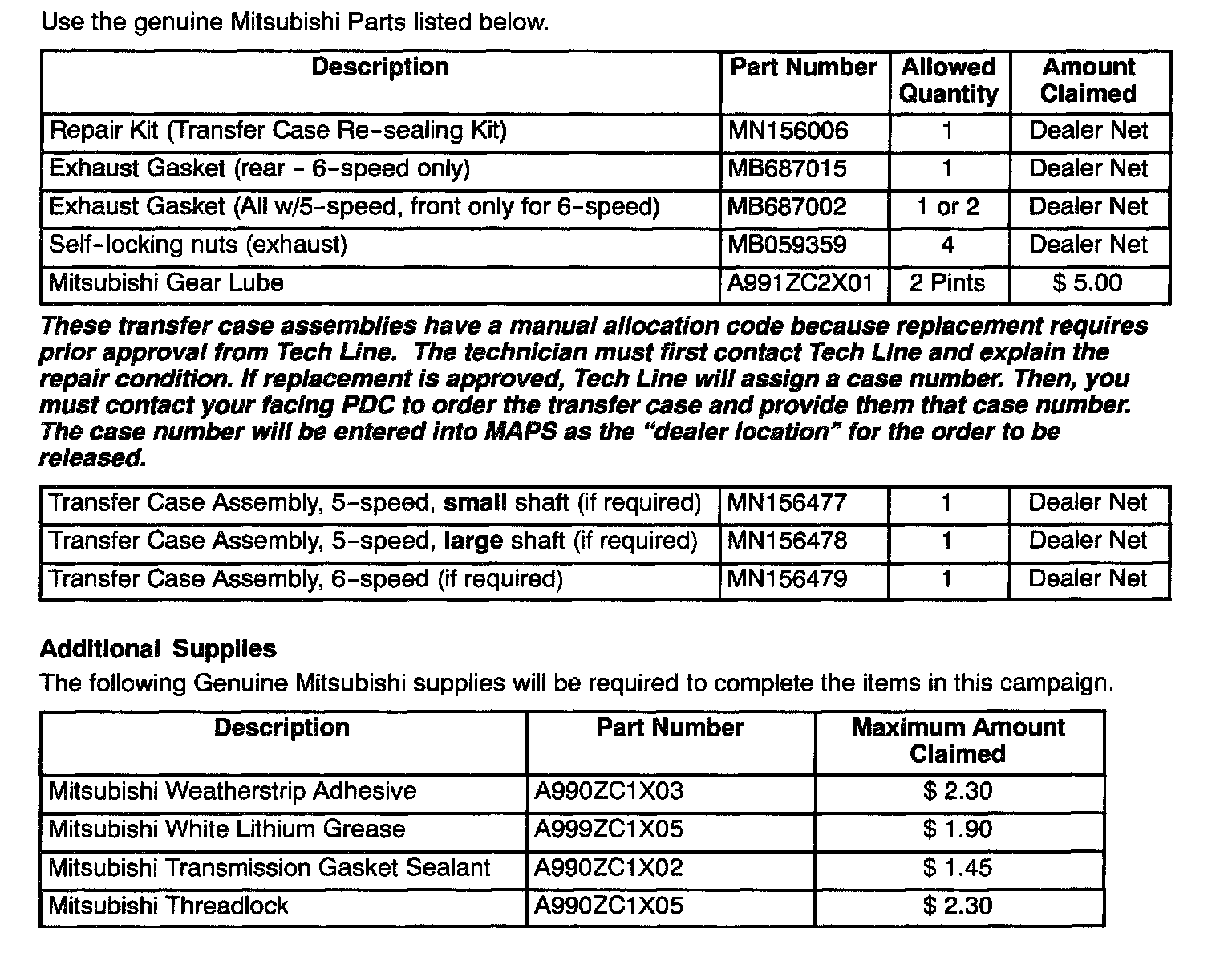 A letter will be sent to all owners of affected vehicles instructing them to bring their vehicle to their Mitsubishi Motors dealer to have the transfer case inspected for leakage and damage and repaired as necessary. A copy of the customer notification letter appears later in this bulletin.