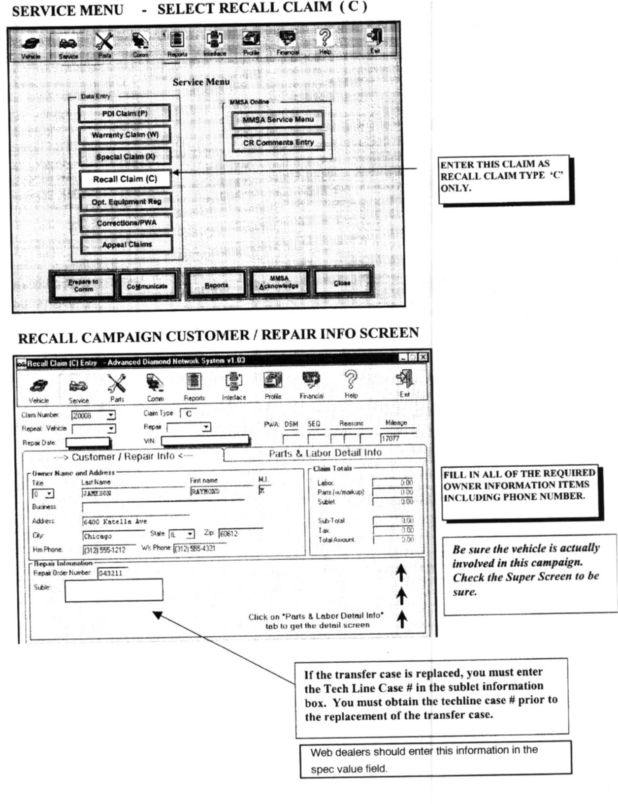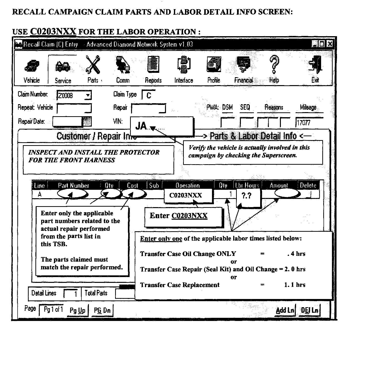 Claims for this campaign must be entered as Recall Type "C" claims on your Diamond Network Service Menu. Sample claim screens are shown on the next pages.
