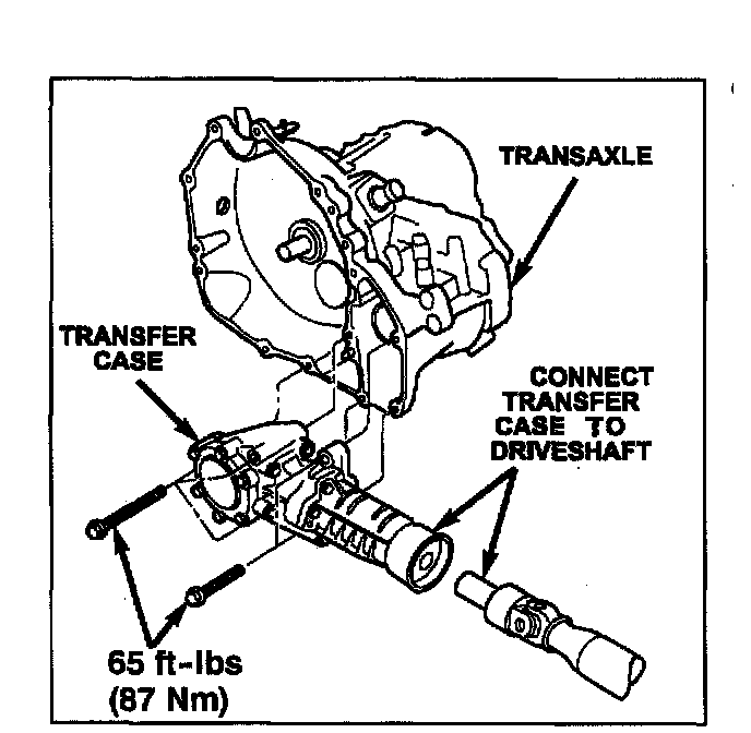 6. Insert the driveshaft into the transfer case and then mount the transfer case onto the transaxle.