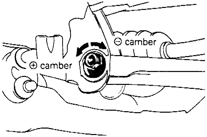Adjust camber by moving mounting bolt located on crossmember side of lower arm. One graduation is equivalent to about 1/5° in camber,