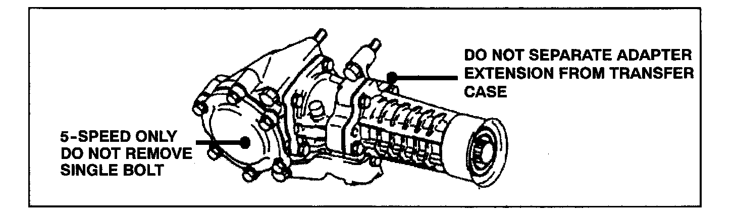 During disassembly of the transfer case, DO NOT separate the transfer case at the area indicated In the above illustration. On 5-speed transfer cases, DO NOT remove the single bolt in the center of the transfer case cover.