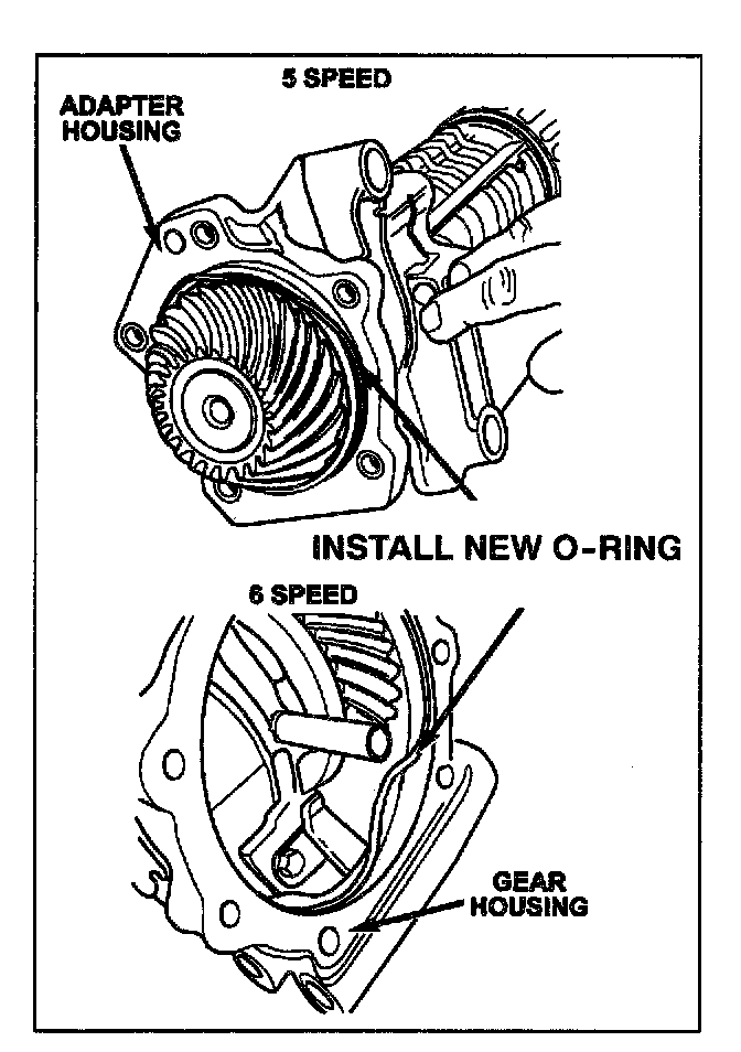 The 0-ring is located on the adapter housing for 5-speed equipped vehicles and in the gear housing for 6-speed equipped vehicles.