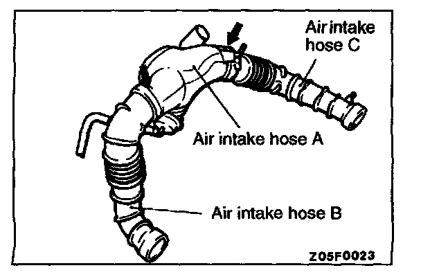 Align slots indicated by arrows in air intake hose A with A markings on air intake hoses B and C; then, insert hoses B and C all the way into air intake hose A.