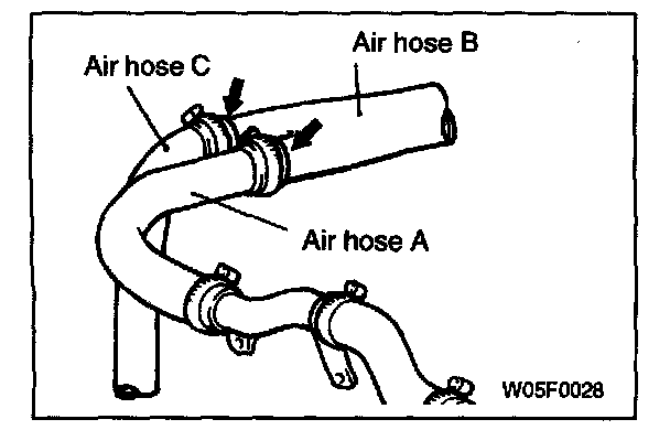 Insert air intake hoses B and C all the way up to the roots on the turbocharger end.