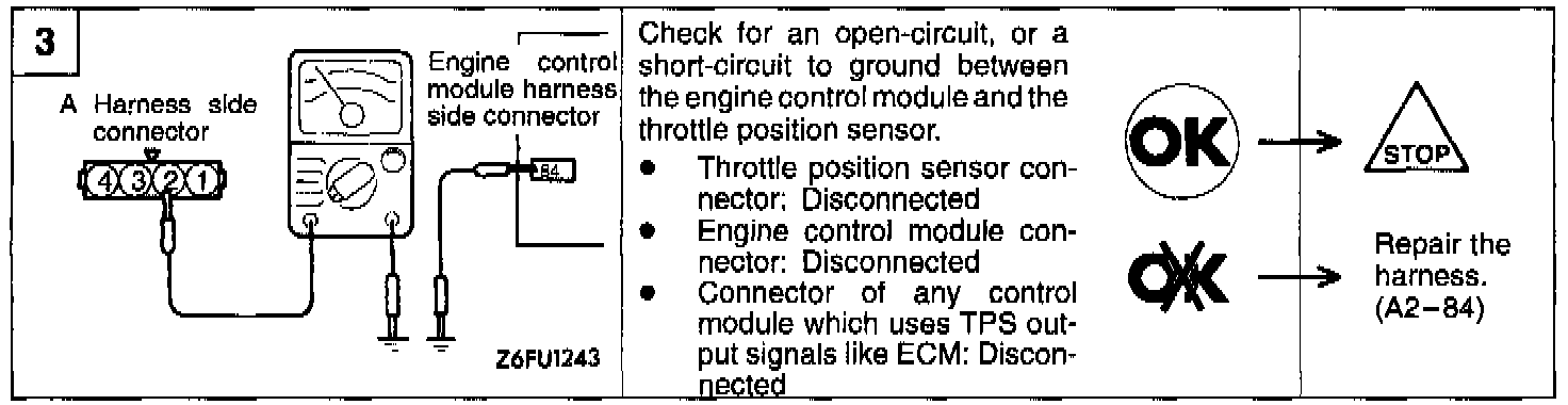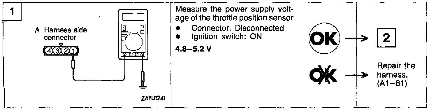Hint 2:If the output voltage of the throttle position sensor is out of specification, adjust the sensor and check the voltage again. If there is an evidence of disturbed fixed SAS setting, adjust the fixed SAS.