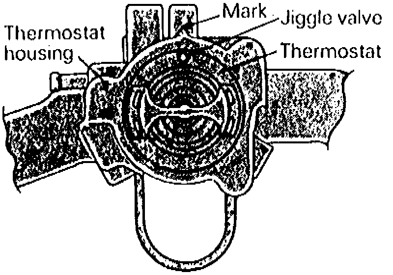 a. Install thermostat with jiggle valve lined up with mark on thermostat housing, Fig. 46.