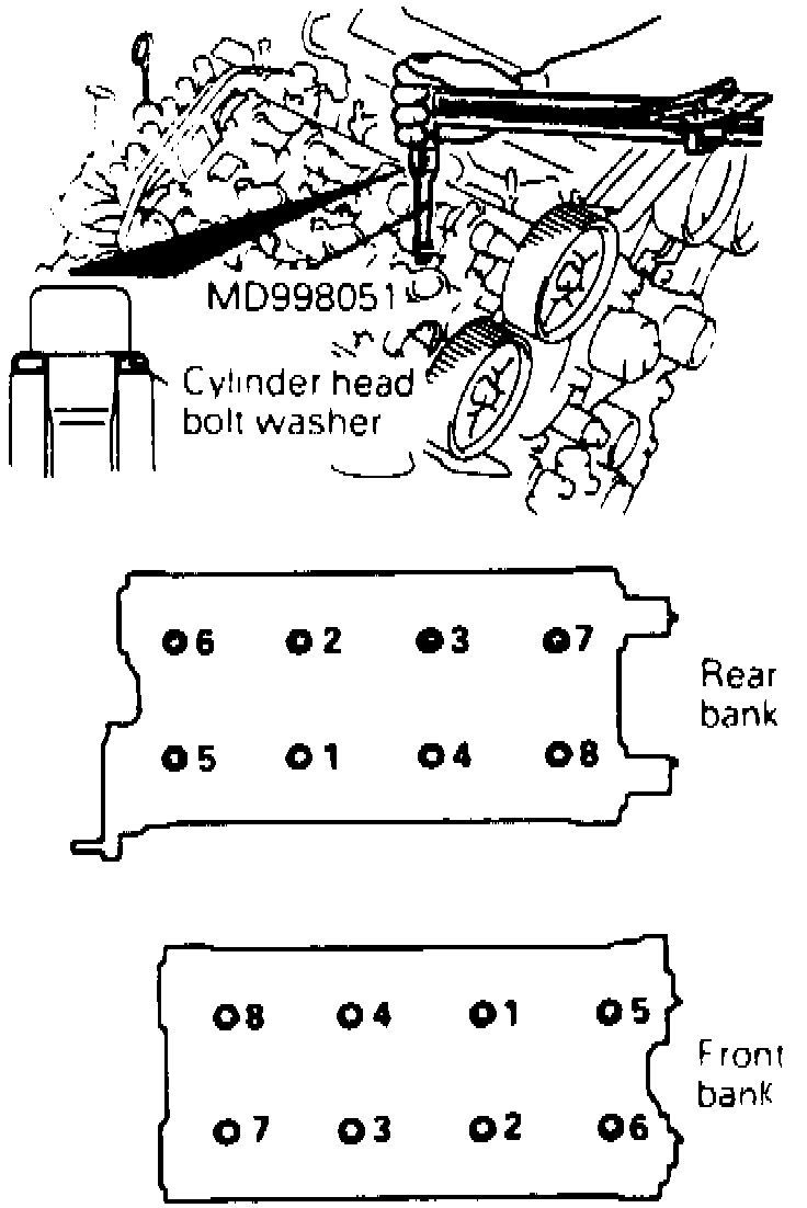 a. Using cylinder head bolt wrench tool No. MD998051-01, or equivalent, remove cylinder head bolts.