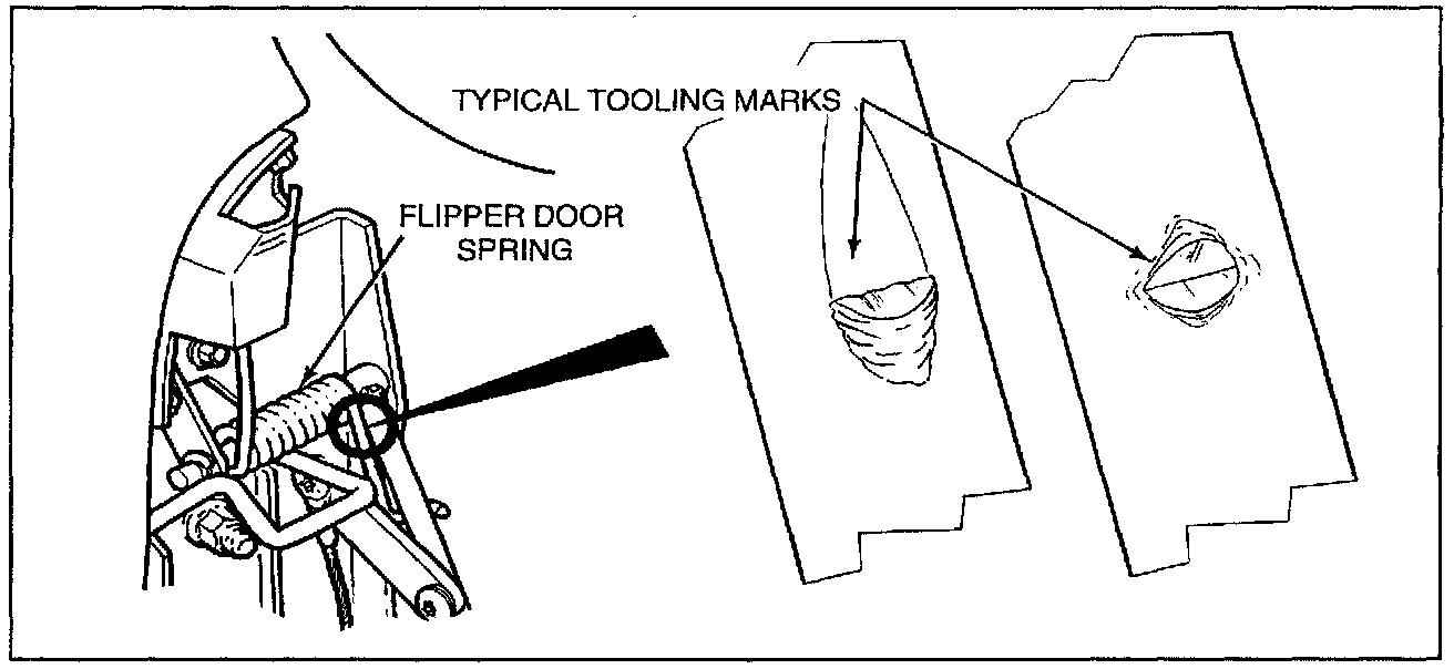 2. Hold down one flipper door at a time and inspect the flipper door spring closely. Look for small tooling marks on the hooked side of the spring near the coil.