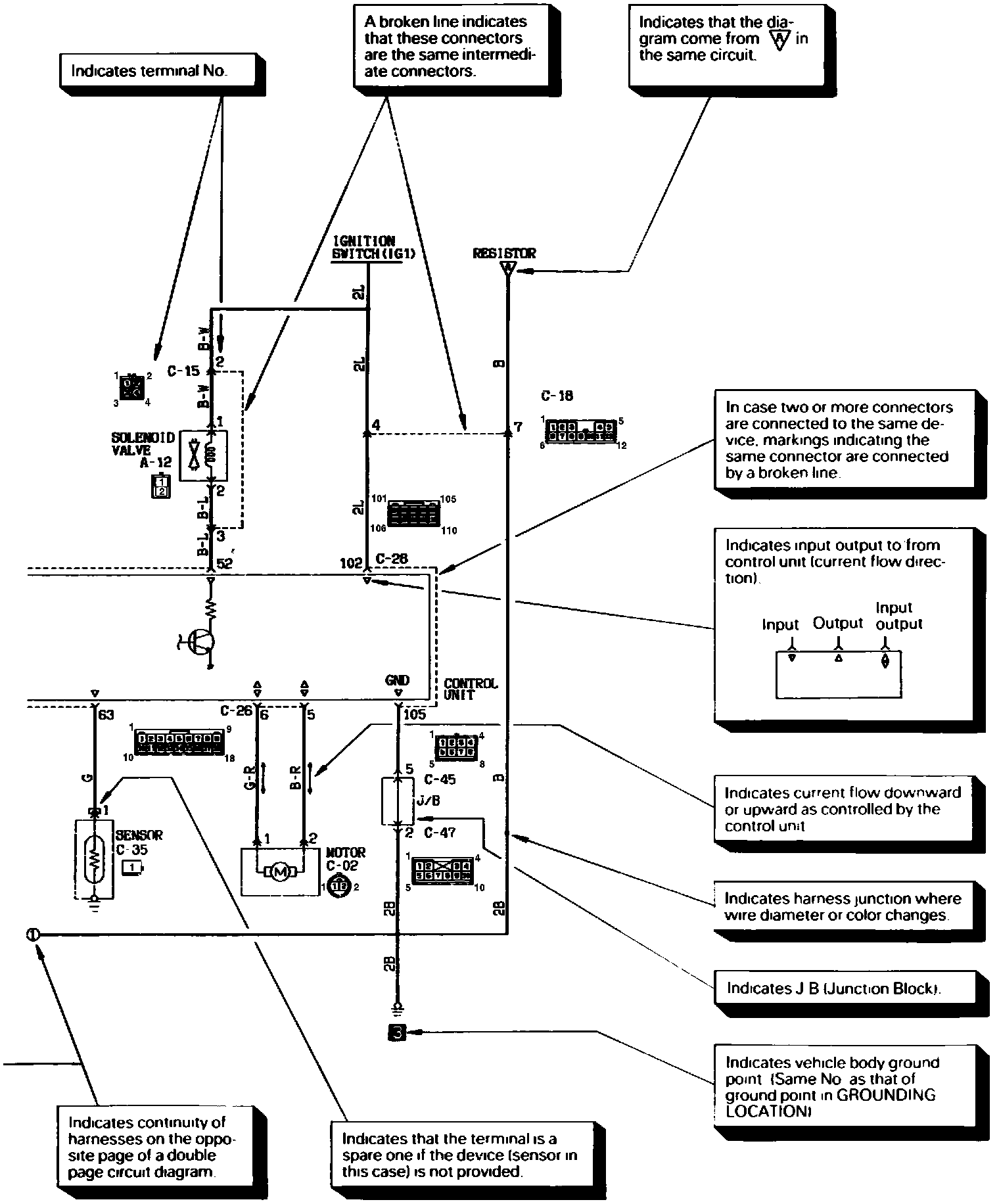The circuit of each system from the fuse (or fusible link) to ground is shown. The power supply at the top and the ground at the bottom to facilitate understanding of how the current flows.