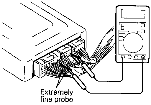 (2) At each terminal of the ECM connector, insert the extremely fine probe from the wire side, and measure the voltage referring to the check chart.