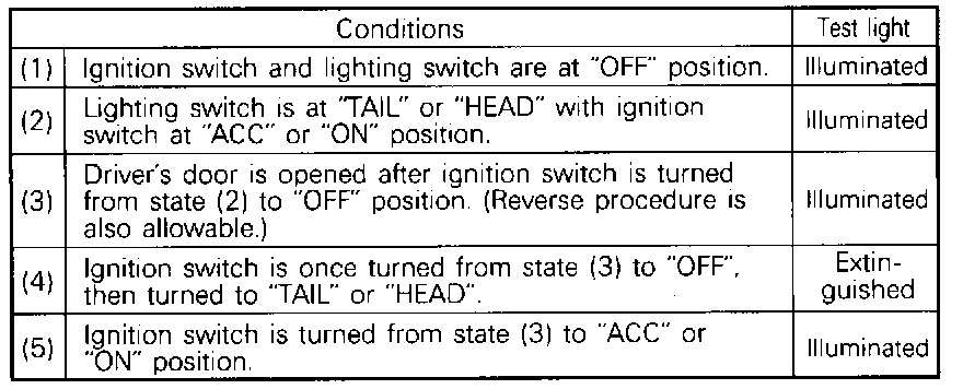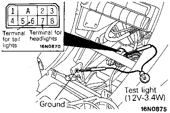 2. Keeping the connector connected to the light automatic shut-off unit, connect the test light (12 V - 3.4 W) from the harness side to terminal No. 6 (for tail lights) or No. 7 (for headlights). According to the above conditions, check the operation of the test light.