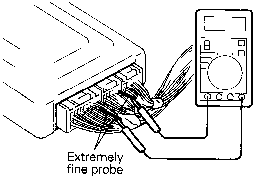 (2) At each terminal of the ECM connector, insert the extremely fine probe from the wire side, and measure the voltage referring to the check chart.