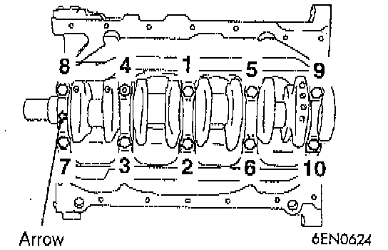 10. Tighten the bearing cap bolts 90 - 100° in the correct tightening sequence, and then check that the painted marks are aligned.