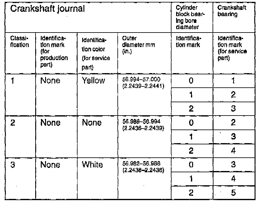- If the measured value of a crankshaft journal outer diameter is between 56.994 - 57.000 mm (2.2439 - 2.2441 inch), the journal is classified as "1" in the illustration. In case the crankshaft is also replaced by a spare part, check the identification colors of the journals painted on the new crankshaft. If the color is yellow, for example, the journal is classified as "1".