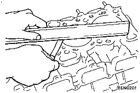 3. Using a straight edge and feeler gauge, check the cylinder head bottom surface for flatness. Flatness should be within 0.05 mm (0.002 inch), and wear limit is 0.2 mm (0.008 inch). If it warps excessively, correct by grinding up to 0.2 mm (0.008 inch) combined with block deck grinding. The height of a new cylinder head is 131.9 - 132.1 mm (5.193 - 5.201 inch).