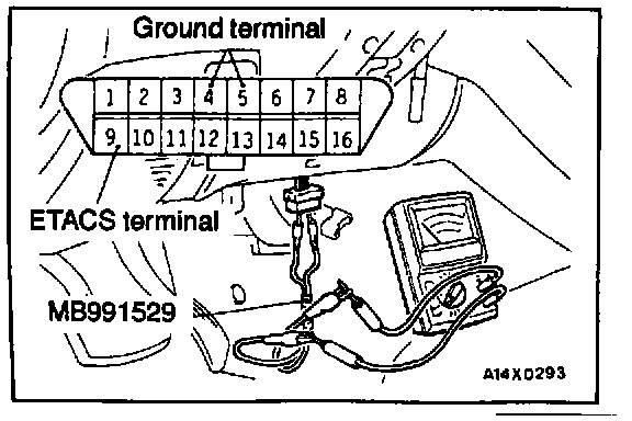 1. Use the special tool to connect a voltmeter between the ground terminal and the ETACS terminal of data link connector.