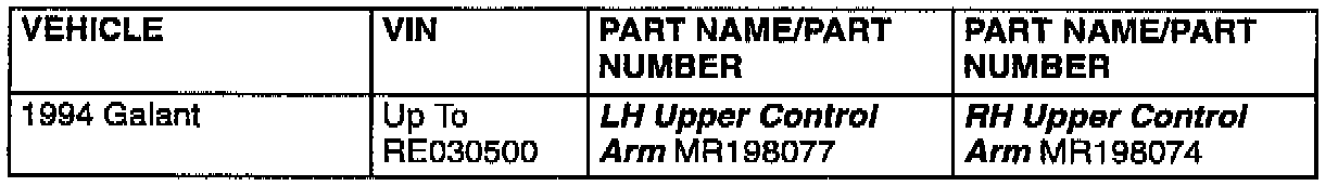If adding these values will bring the front camber into specification, replace both the right and left upper control arms with the parts specified in the second chart in the PARTS INFORMATION section of this bulletin, Refer to replacement instructions on pages 33A-6 and 33A-7 of the 1994-95 Galant Service Manual. The new upper control arms are different than the original parts. The new parts will change the front camber reading.