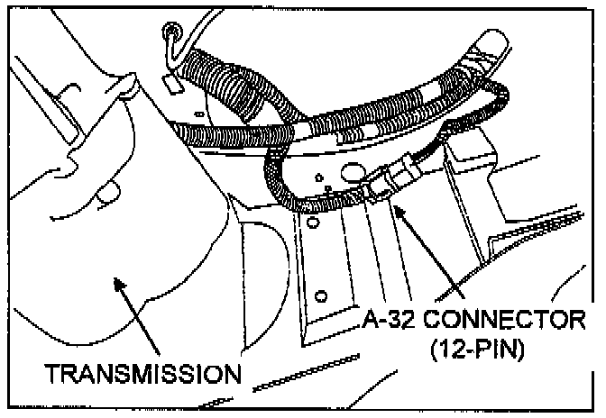 4. Connector A-32 is mounted against the lower left frame rail. Inspect connector A-32 for corrosion. Disconnect the connector and check the pin contacts.