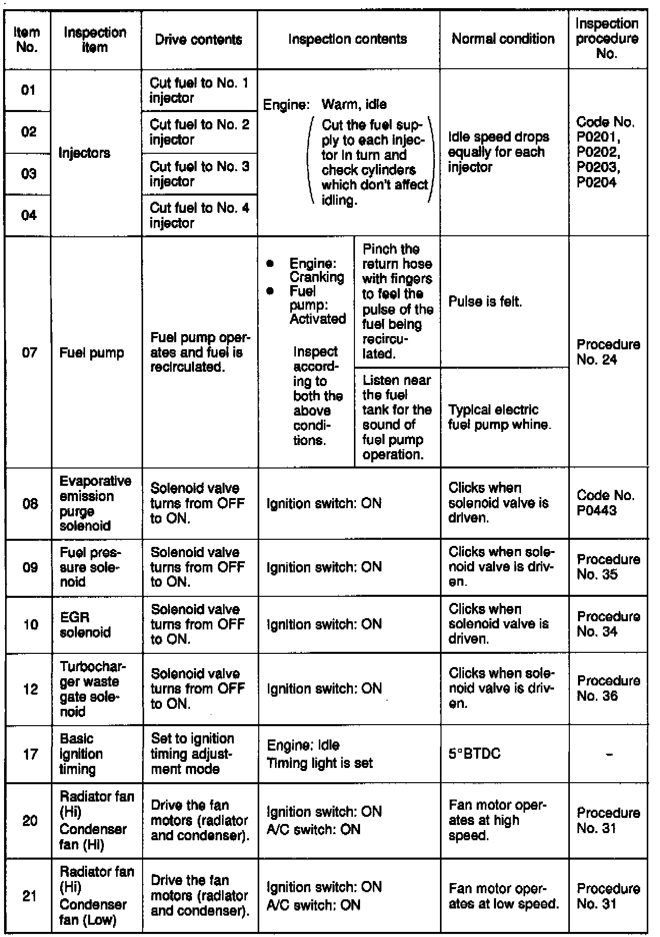 Actuator Test Reference Table
