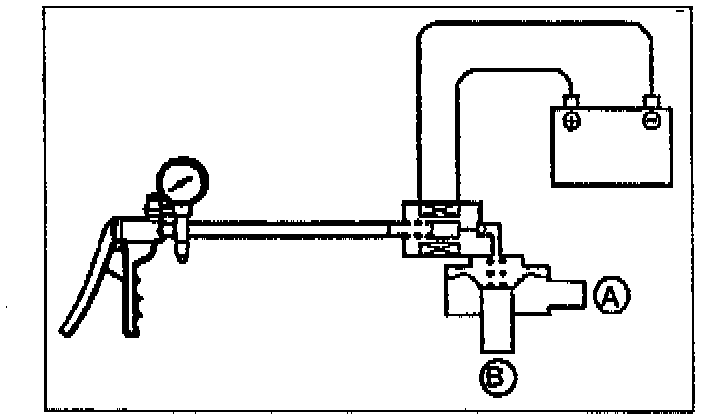 d. Test airflow between A and B by connecting and disconnecting the negative battery terminal side jumper wire, and applying 67 kPa (20 in. Hg) of vacuum.