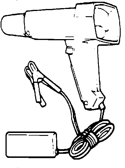 A specially designed strobe light used to check ignition timing. The timing light is connected to number one spark plug and flashes each time the ignition system "fires" that plug. The flash illuminates the timing mark which appears to stand still during illumination allowing for adjustment on vehicles which allow adjustment of the timing. Follow the manufacturer's instructions for connection and operation of timing light.