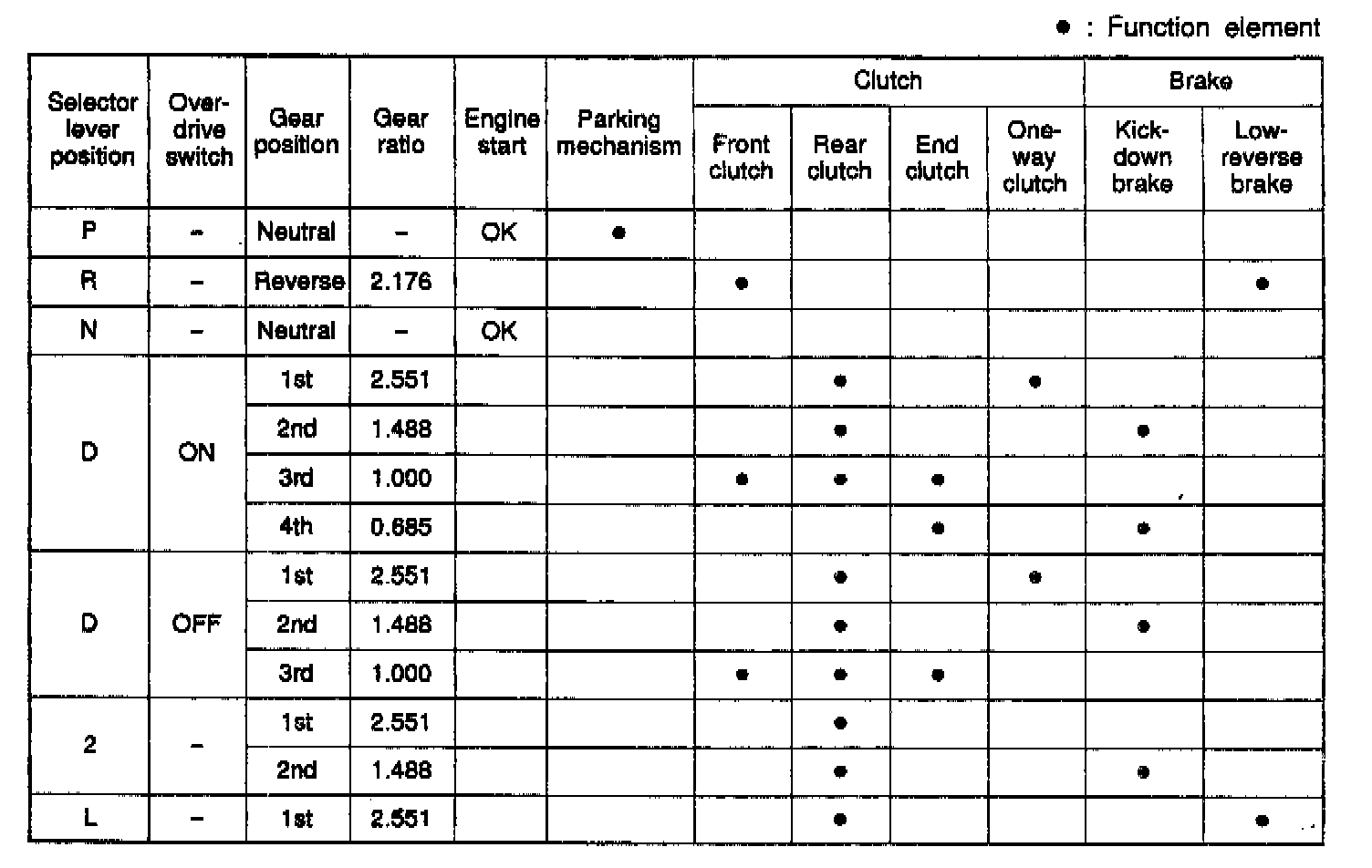 4-spd A/T, Function Element Chart:
