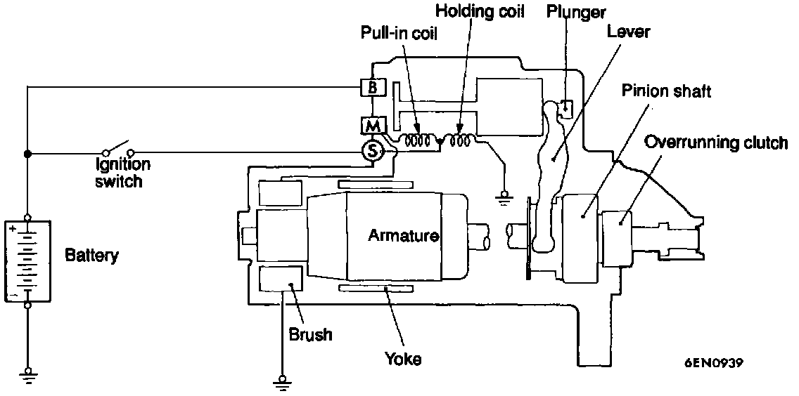 When the ignition switch is turned to the "START" position, current flows in the Pull-in and Holding coils inside the magnetic switch (starter solenoid), attracting the plunger. When the plunger is attracted, the lever connected to the plunger engages the starter clutch and completes the circuit between the "B" and "M" terminals, providing current to the starter motor.