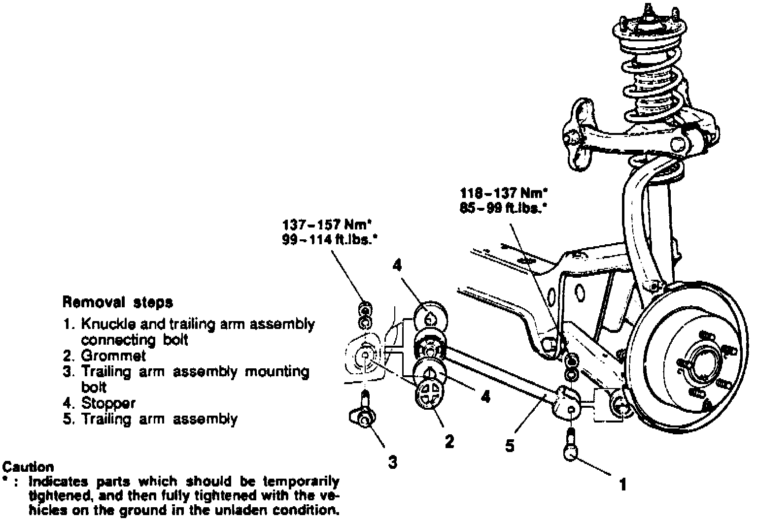 2. Remove trailing arm assembly grommet, mounting bolt and stopper.