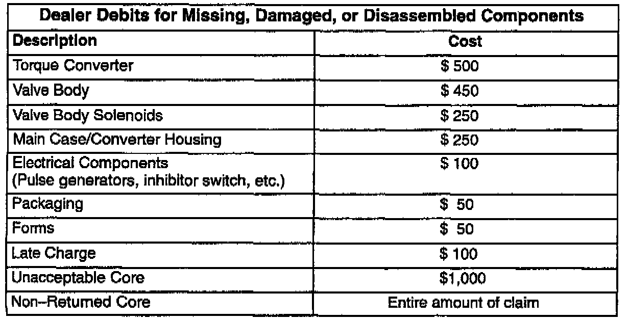 11. Ensure that all components are returned and attached properly to the core, e.g. dipstick, dipstick tube, inhibitor switch, pulse generators, etc. Cores received at the remanufacturing facility with missing and/or disassembled components will result in a warranty claim debit to the dealer. The chart lists the debit amounts that will be incurred if the core is not returned properly.