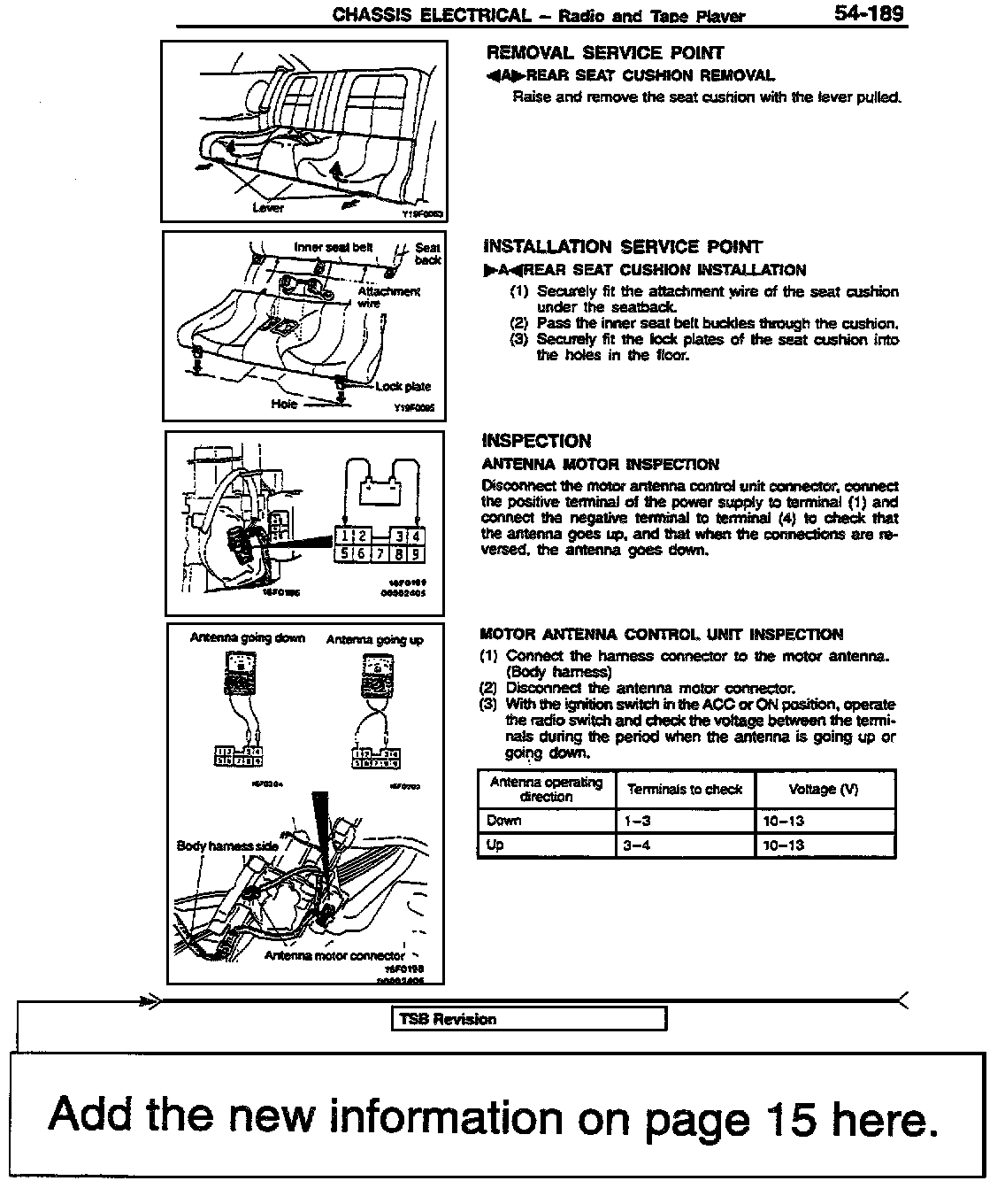 1992-96 3000GT Service Manual, Volume 2, Page 54-189 Add the new glass antenna caution and inspection procedures on page 15 of this bulletin to the area shown.
