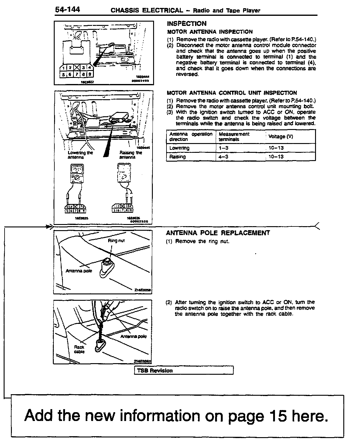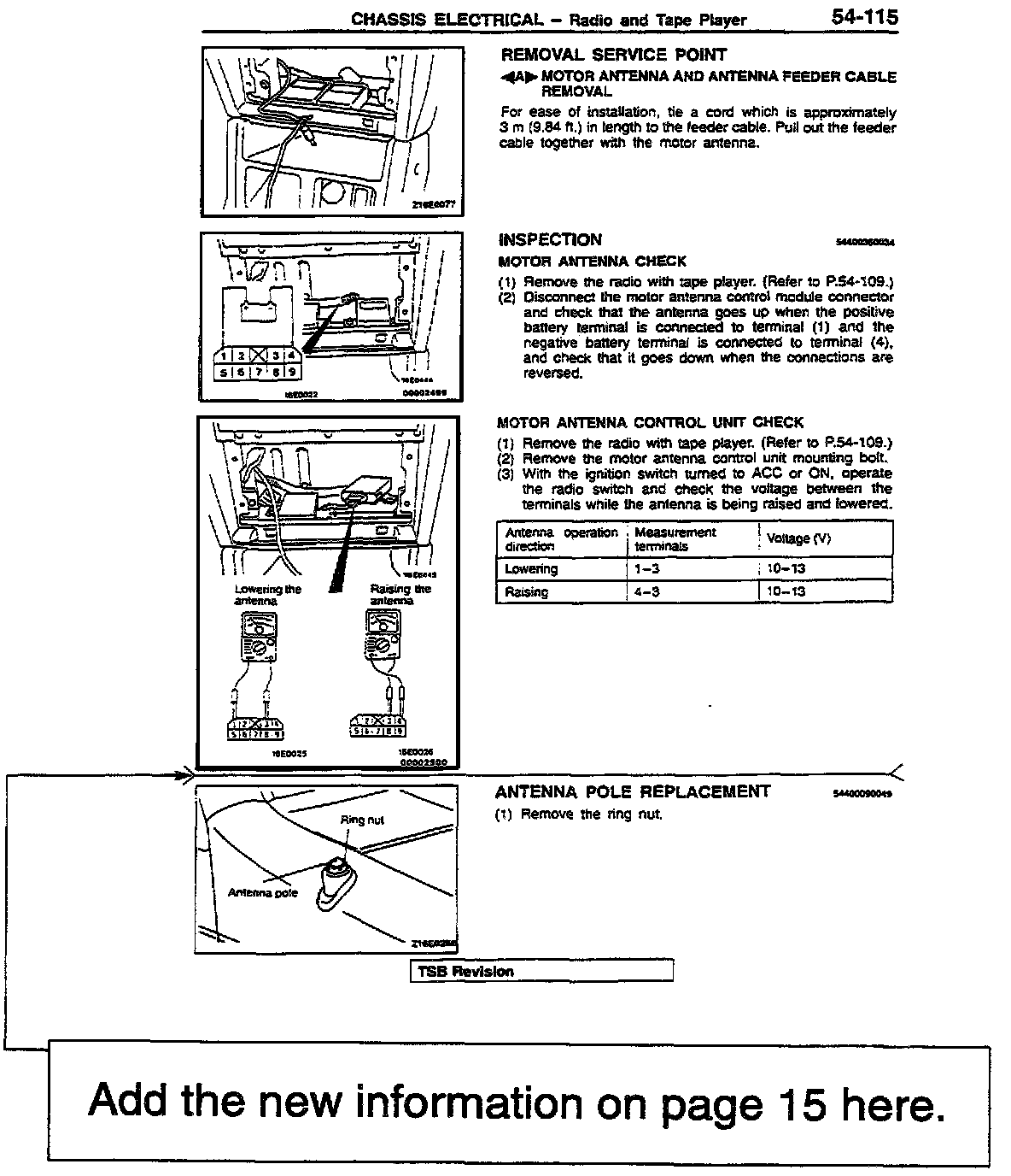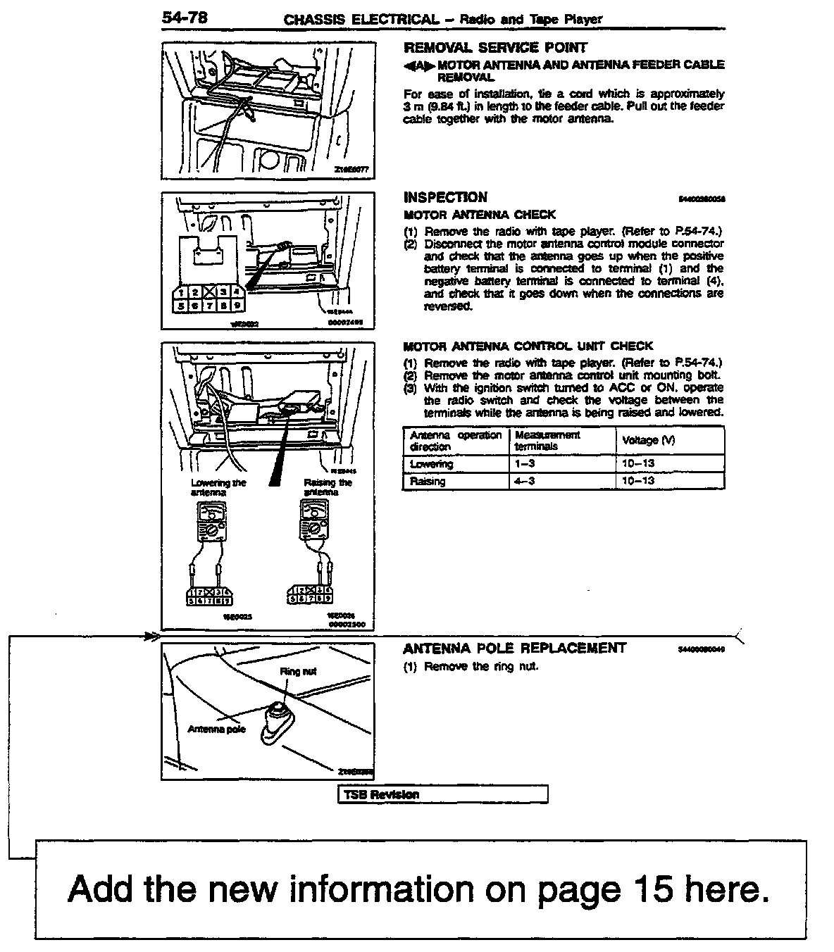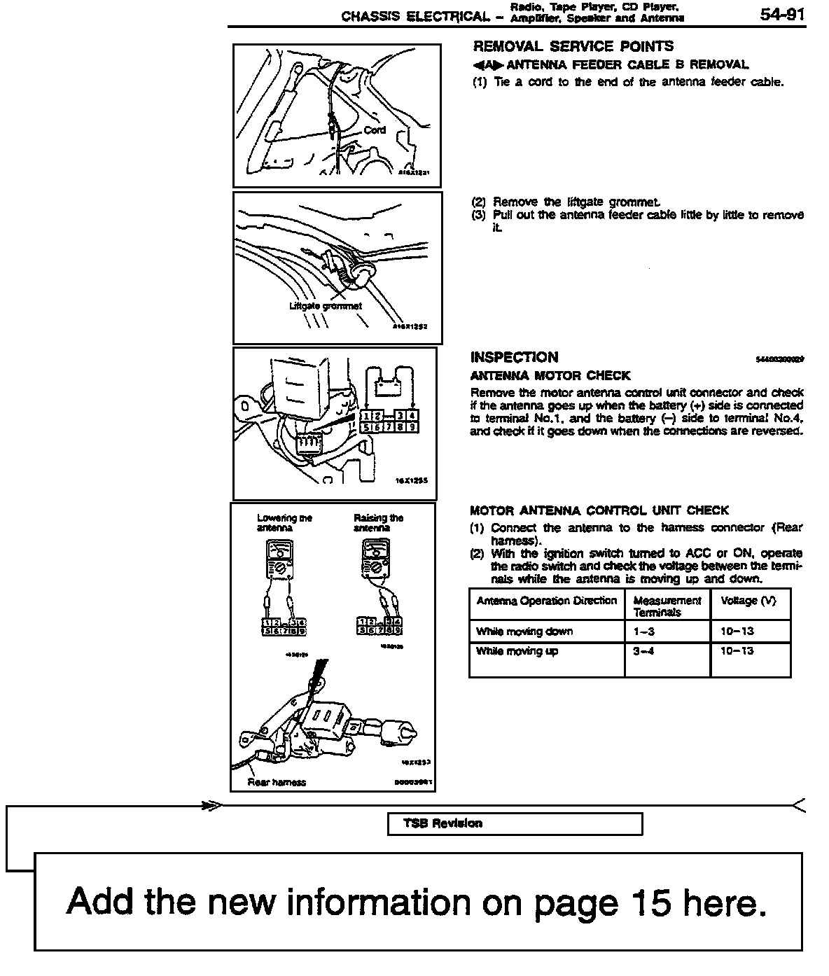1994-95 Galant Service Manual, Volume 2, Page 54-129 Add the new glass antenna caution and inspection procedures on page 15 of this bulletin to the area shown.