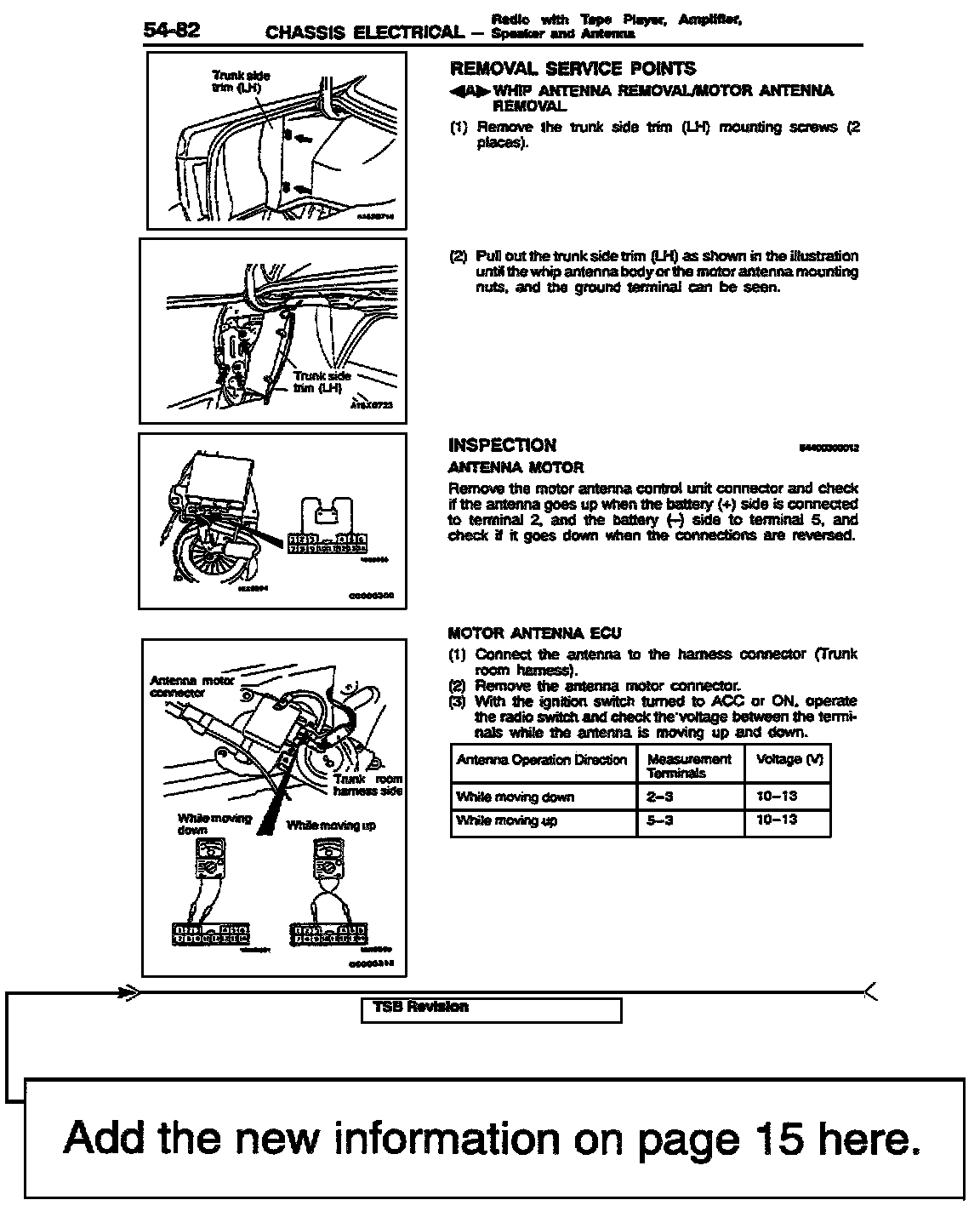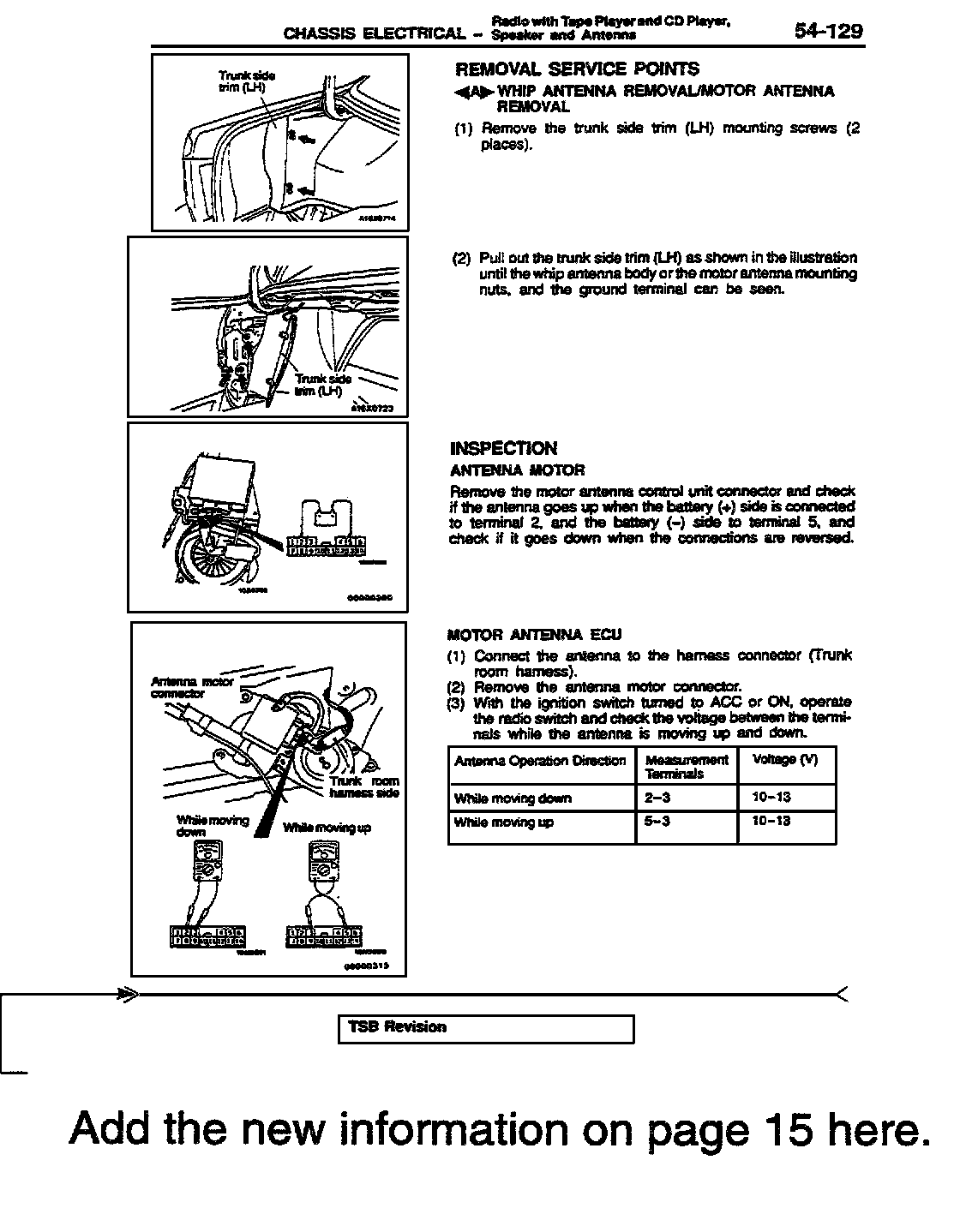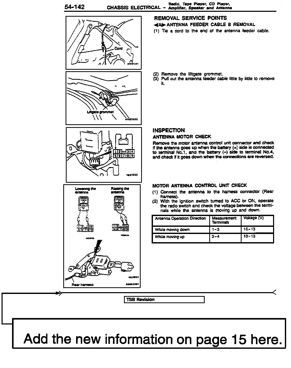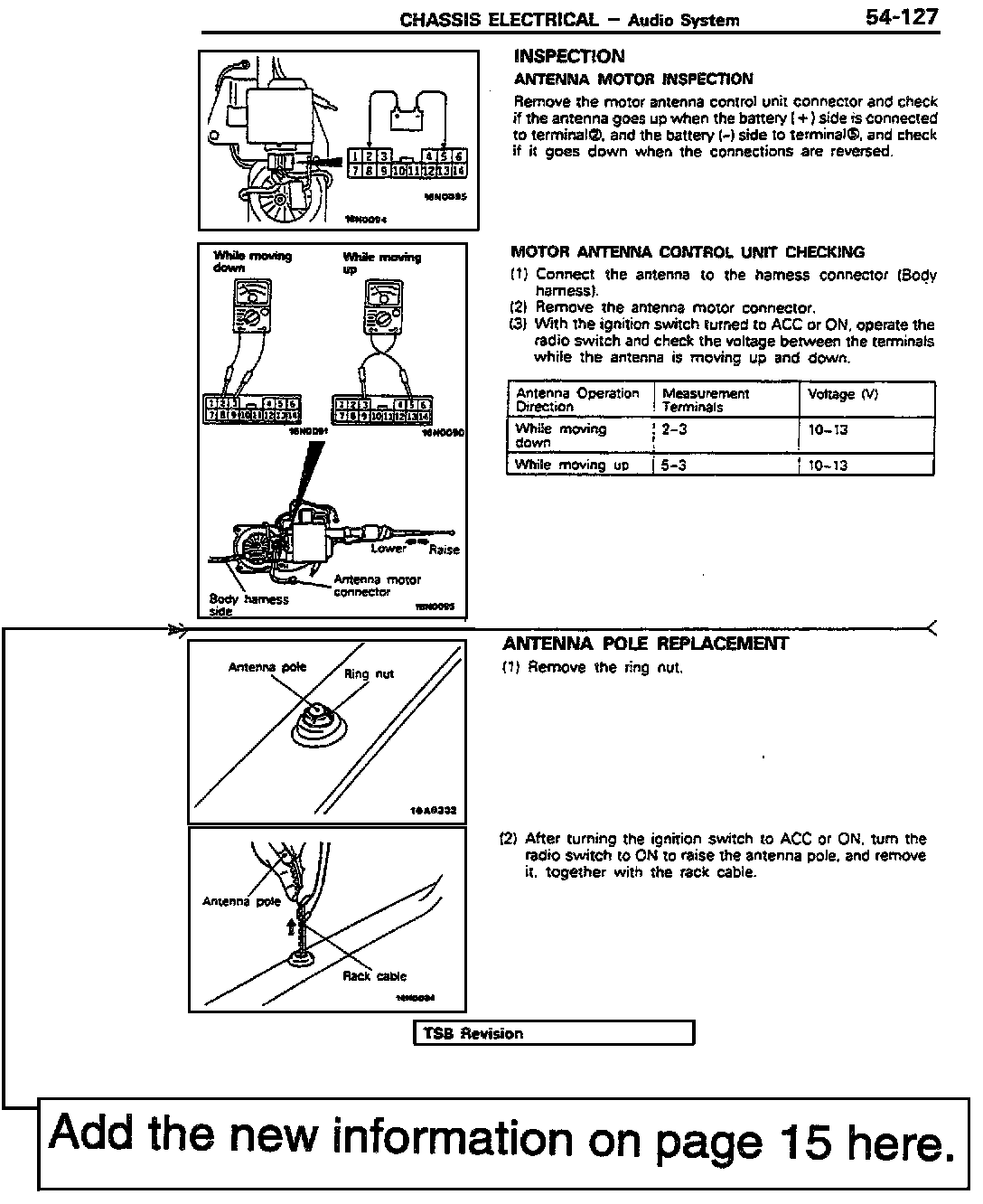 1994-95 Galant Service Manual, Volume 2, Page 54-129 Add the new glass antenna caution and inspection procedures on page 15 of this bulletin to the area shown.