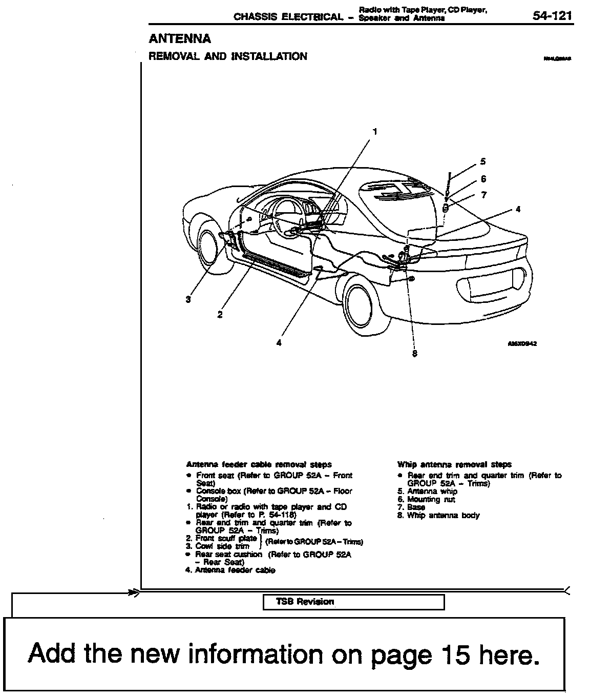 1995 Eclipse Service Manual, Volume 2, Page 54-121 Add the new glass antenna caution and inspection procedures in the next to the last image of this bulletin to the area shown.