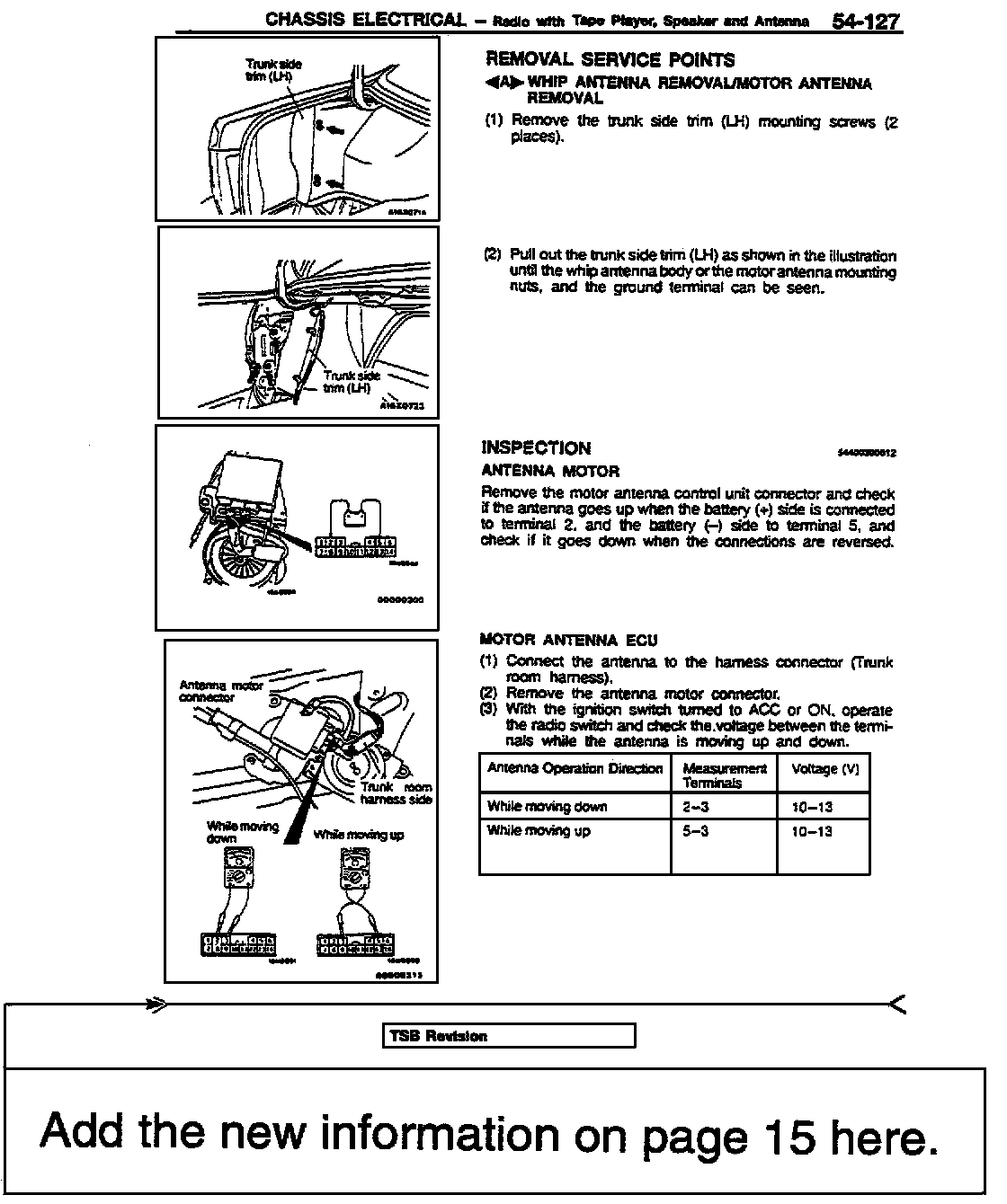 1996 Galant Service Manual, Volume 2, Page 54-127 Add the new glass antenna caution and inspection procedures in the next to the last image of this bulletin to the area shown.