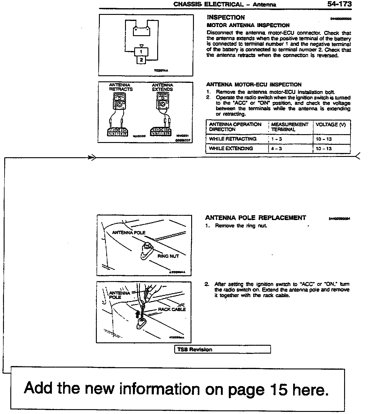 1997 Montero Sport Service Manual, Volume 2, Page 54-173 Add the new glass antenna caution and inspection procedures in the next to the last image of this bulletin to the area shown.