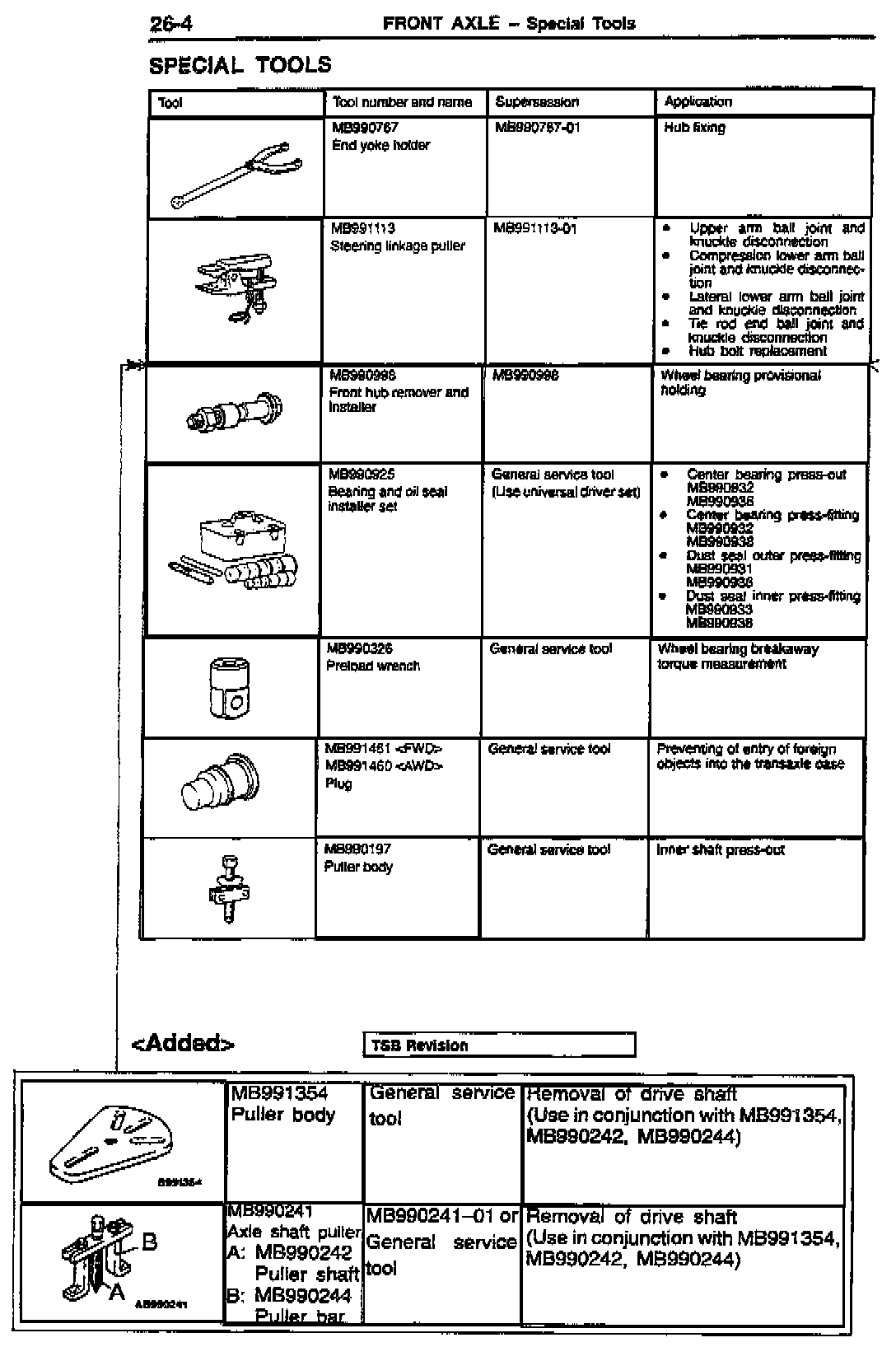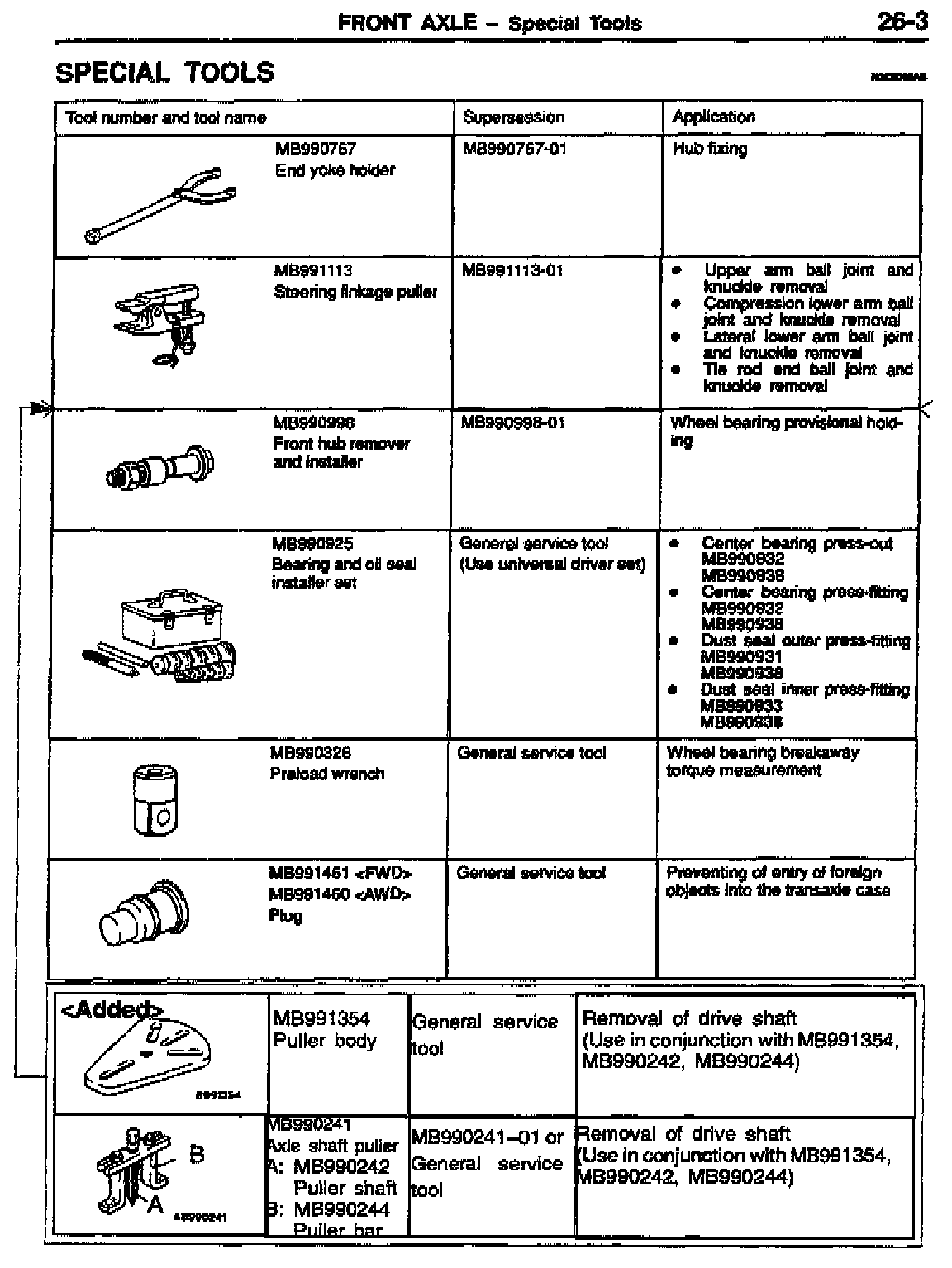 This bulletin contains corrected front axle (drive shaft) removal procedures. Also, special tools required for axle removal, which were omitted from the original manuals, are added.