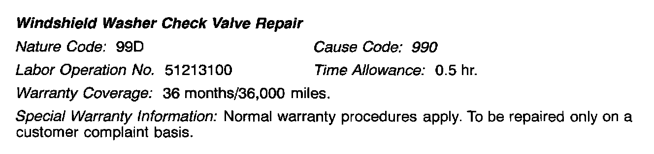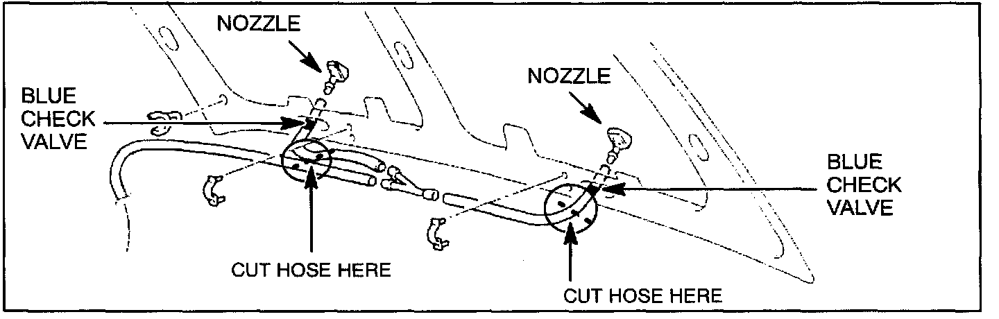 Some affected vehicles may experience a small leak ("dribble") from one or both of the front windshield washer nozzles after the washer is turned off. To eliminate this condition, install new, improved check valves and straight-through joints as described in this bulletin.