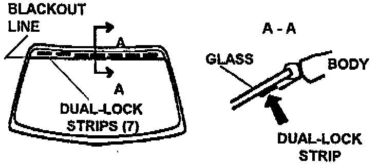 c. Remove the backing and affix the seven Dual-Lock strips along the top edge of the windshield, against the sheet metal flange. Do not affix the Dual-Lock strips beyond the windshield blackout line.
