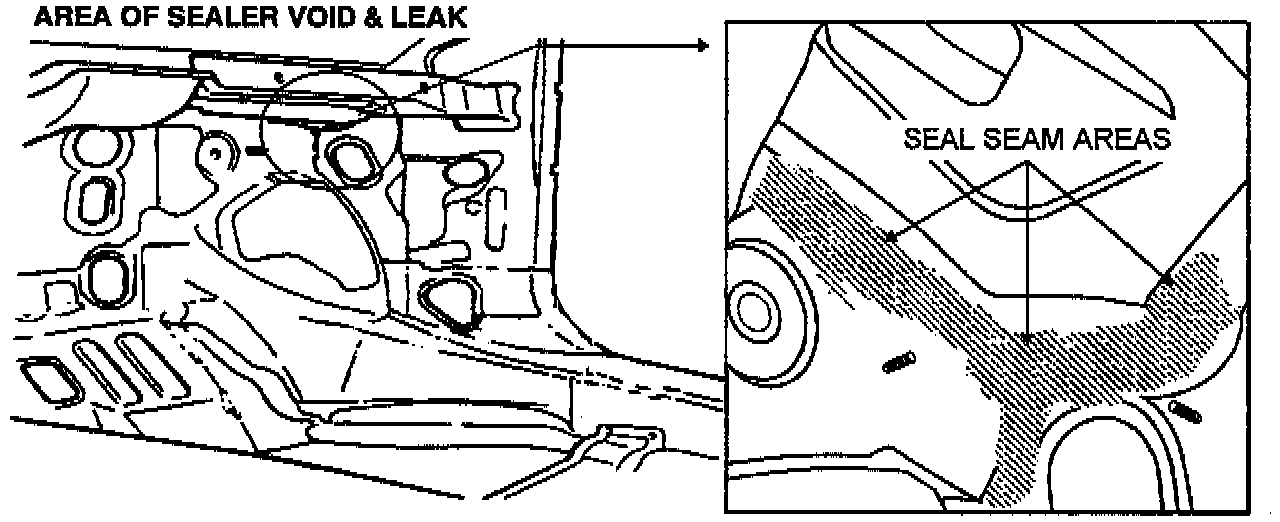 11. Inspect the seam to locate any break in the sealant or incomplete coverage of the sheet metal joints. See the indicated area in the illustration. If a sealant break or void is found, apply sealer (RTV silicone or equivalent) to the seam, shown as the shaded area in the illustration inset. If no void is identified, reseal the entire seam. The sealant break or void may be too small to be seen.