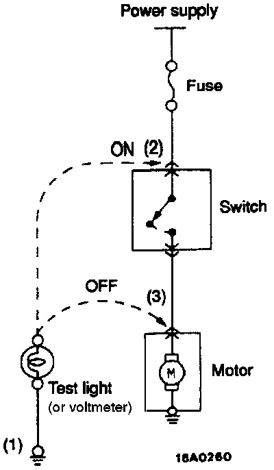 1. Ground one lead wire of the test light. If a voltmeter is used instead of the test light, ground the grounding side lead wire.