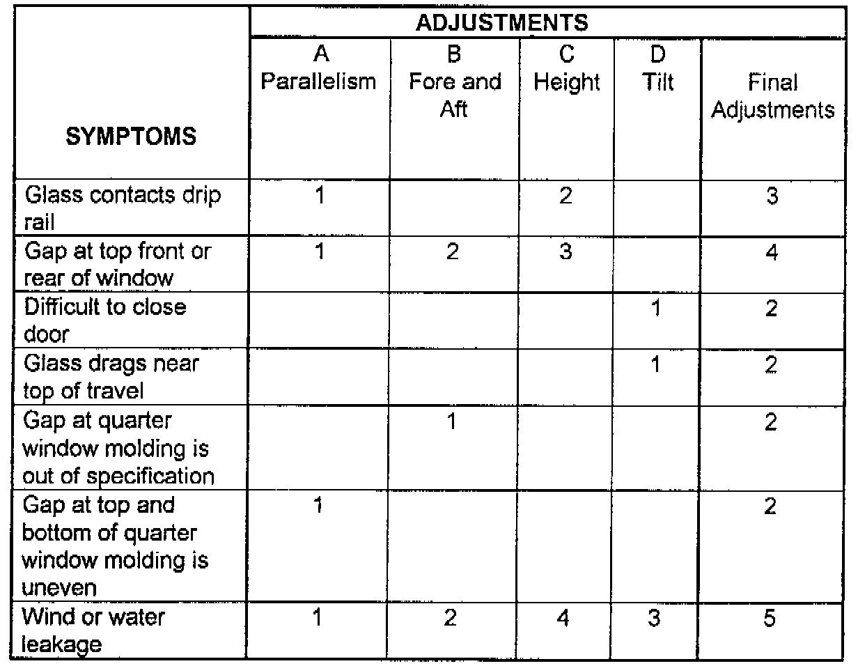 SYMPTOM CHART1. Use the chart and the measurements taken on the previous pages of this bulletin to determine possible glass adjustments required to correct glass misalignment.