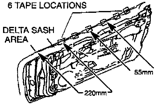 4. Fold six pieces of foam tape over the body flange where the beltline moulding attaches. Space the tape about 55 mm to 60 mm apart starting at 220 mm from the front edge of the flange (about 20 mm behind the rear edge of the delta sash mounting area).