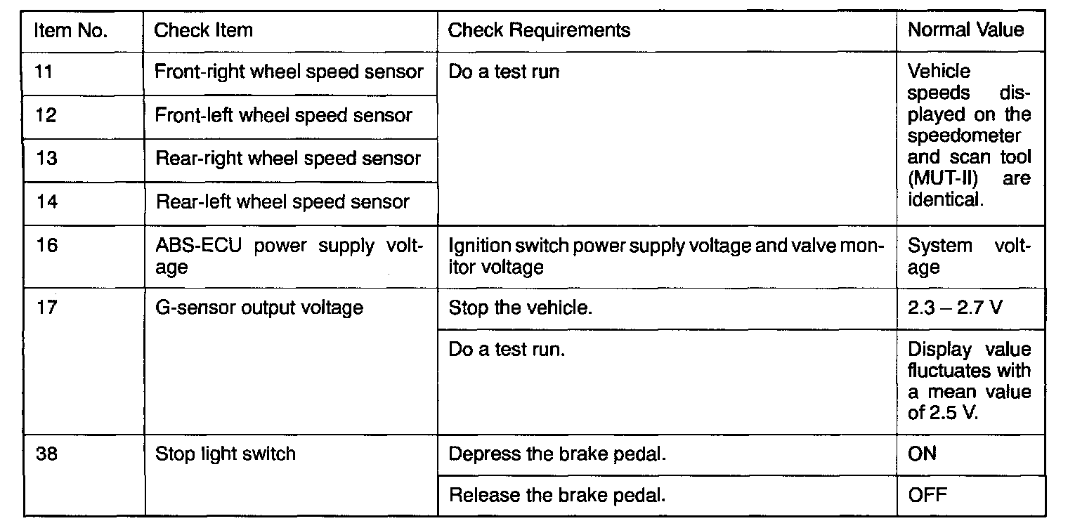 SERVICE DATA REFERENCE TABLEThe following items can be read by the scan tool (MUT-II) from the ABS-ECU input data.